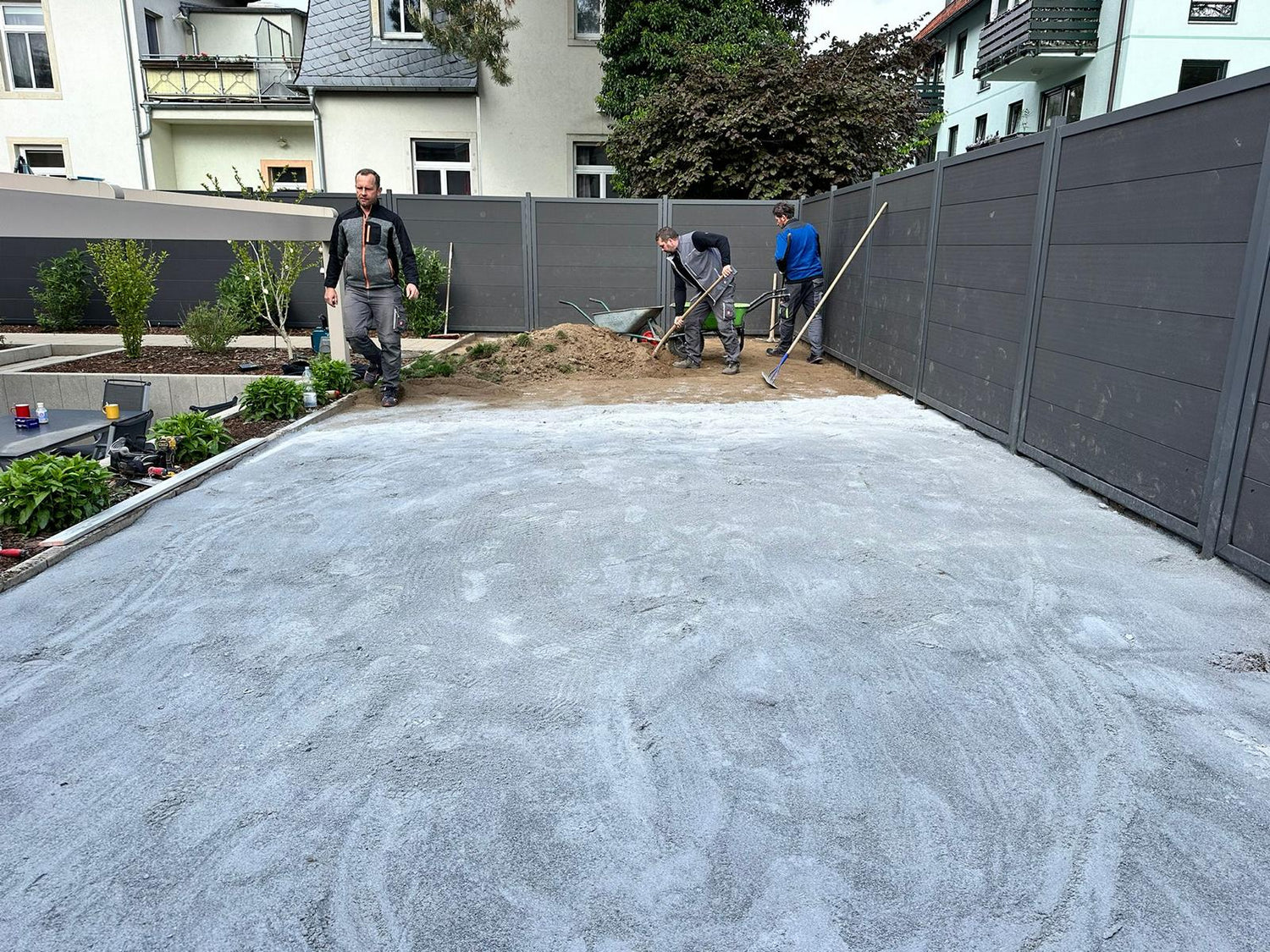 Bodenvorbereitung: Der Boden wird verdichtet und geebnet. Eine leichte Neigung wird eingeplant, um die Entwässerung zu erleichtern.