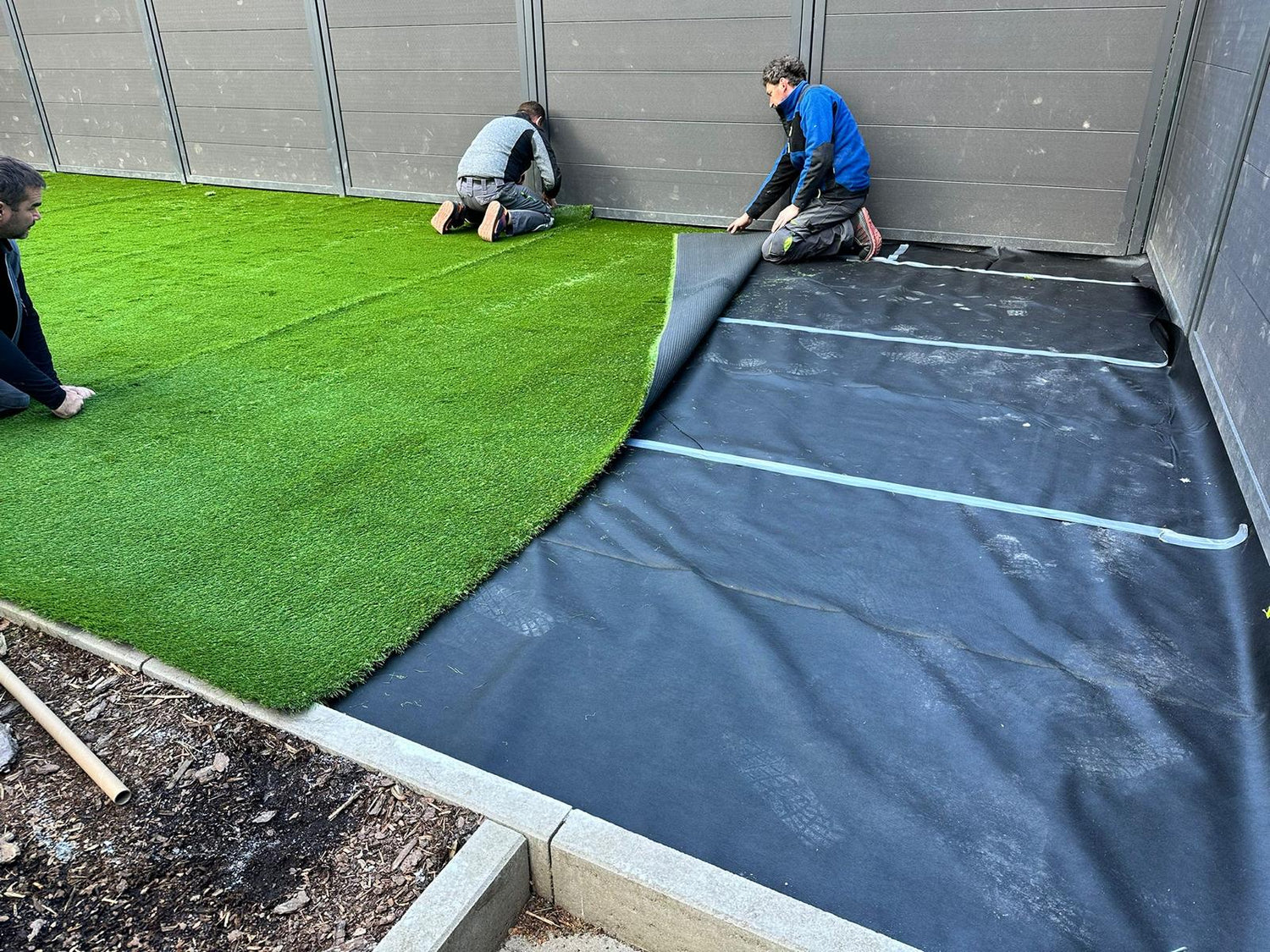 - Fachgerechte Verlegung: Die Verlegung erfolgt mit präziser Technik, um sicherzustellen, dass die Nähte unsichtbar sind und der Rasen fest und eben liegt.