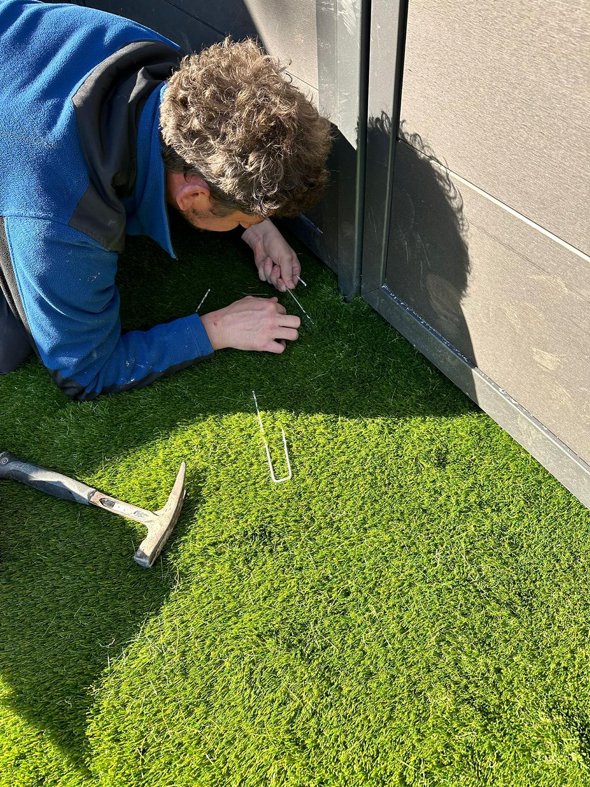 Befestigung: Der Kunstrasen wird mit speziellen U-förmigen Nägeln oder Erdankern am Boden fixiert, insbesondere an den Rändern und Nahtstellen.