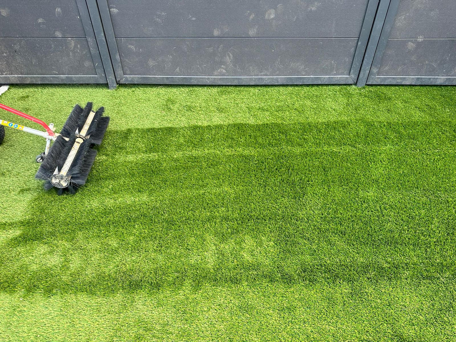 Bürsten: Der Kunstrasen wird mit einer speziellen Bürste aufgerichtet und der Sand gleichmäßig in die Fasern eingearbeitet.