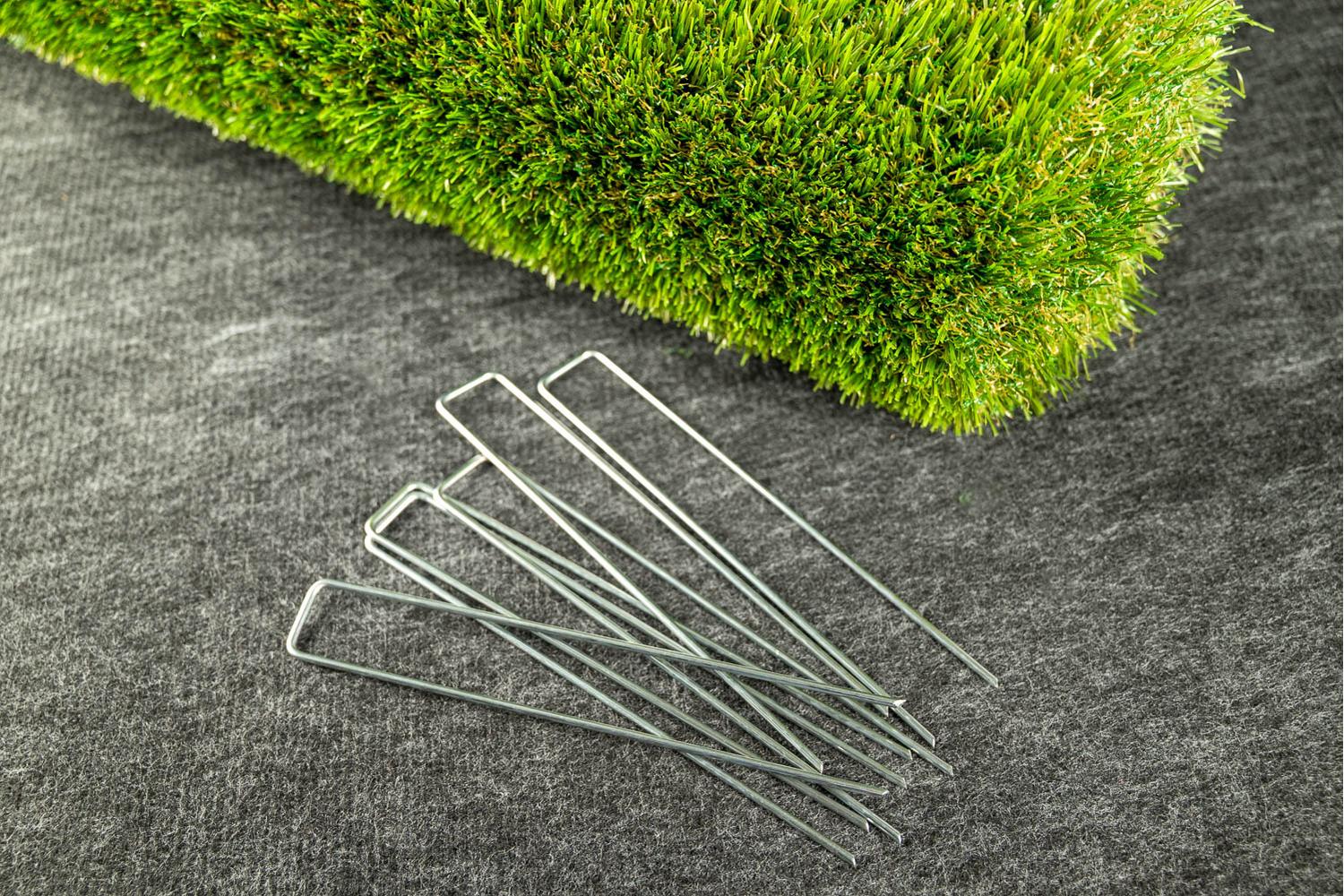 Die U-Pegs werden entlang der Kunstrasen-Kanten oder an den Nahtstellen in den Boden eingeschlagen. Der U-Bogen legt sich über die Rasenfasern und hält diese unsichtbar fest. Für ein optimales Ergebnis empfehlen wir einen Abstand von 50–100 cm zwischen den Befestigungspunkten.